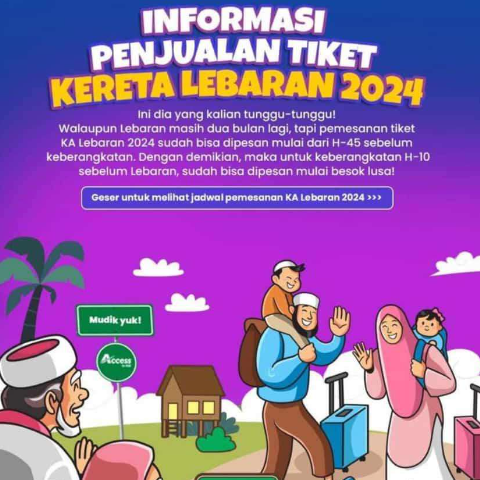 PT Kereta Api Indonesia (KAI) Daop 2 Bandung telah membuka penjualan tiket kereta api pada periode angkutan Lebaran 2024 mulai tanggal 15 Februari 2024 atau H-45 untuk keberangkatan 31 Maret 2024 atau H-10 Lebaran.