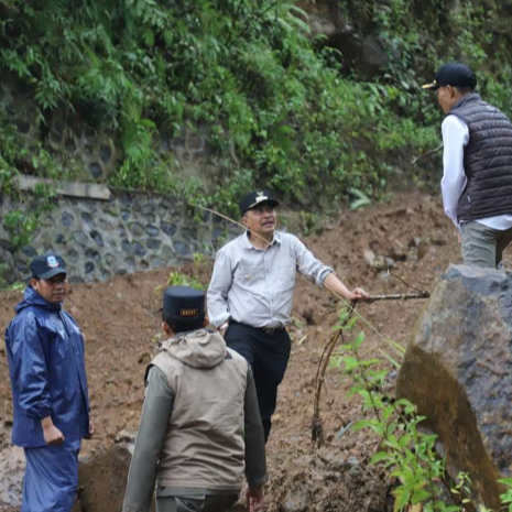 Pj  Bupati Garut, Barnas Adjidin memantau lokasi bencana tanah longsor di Desa Sukarame, Kecamatan Caringin, Kabupaten (6/3/2024).