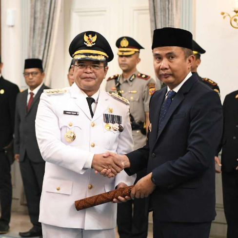 Penjabat (Pj) Gubernur Jawa Barat Bey Machmudin melantik Budi Waluya sebagai Pj Bupati Ciamis dan Agus Toyib sebagai Pj Bupati Kuningan di Gedung Pakuan, Kota Bandung, Jumat (1/11/2024).